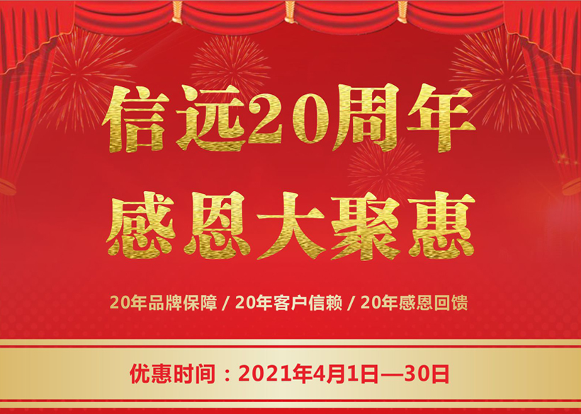 信遠(yuǎn)科技即將于2021年4月18日迎來成立20周年的喜慶日子。為答謝客戶、回報(bào)社會,經(jīng)公司研究決定,自2021年4月1日至30日開展為期一個(gè)月的產(chǎn)品優(yōu)惠福利活動。歡迎廣大新老客戶電話咨詢或前來考察洽談,信遠(yuǎn)科技全體職工真誠恭候您的到來!