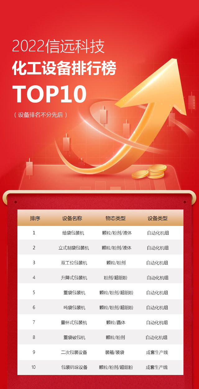 日前,安徽信遠(yuǎn)包裝科技有限公司化工包裝機(jī)事業(yè)部發(fā)布了“2022信遠(yuǎn)科技化工設(shè)備TOP10排行榜”。榜單顯示的十類機(jī)械設(shè)備,主要應(yīng)用在石化、電力、煤炭、冶金、能源、礦產(chǎn)、輕工、建材、玻璃、消防、肥料、農(nóng)藥、塑料、橡膠、皮革、染料、顏料、涂料、新材料等行業(yè)中不同化工物料的產(chǎn)品包裝上,物料形態(tài)包括顆粒、晶體、粉劑和超細(xì)粉體物料,設(shè)備類型以自動(dòng)化機(jī)組為主,成套生產(chǎn)線為輔。