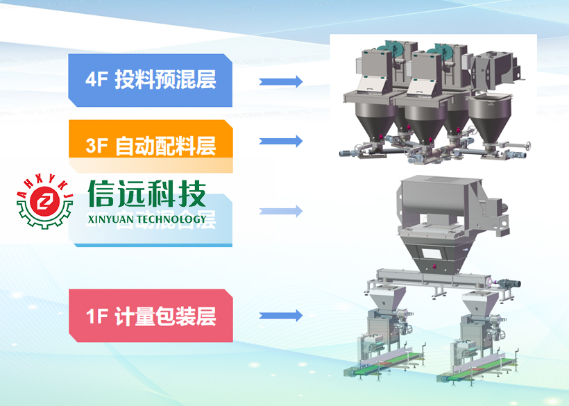 今天就由安徽信遠(yuǎn)包裝科技小編帶大家了解一下全自動(dòng)粉劑水溶肥生產(chǎn)線的組成部分。全自動(dòng)粉劑水溶肥生產(chǎn)線大體上由4層結(jié)構(gòu)組成。從上至下,第4層投料預(yù)混層,第3層自動(dòng)配料層,第2層自動(dòng)混合層,第1層計(jì)量包裝層。如下圖
