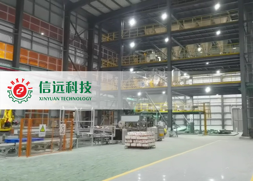 這套設(shè)備是原料經(jīng)過人工投料后,不同配方、不同配置比例的物料原料會自動進行自動配料和自動混合。混合均勻后的原料輸送至包裝機上方的儲料倉斗內(nèi),倉斗內(nèi)的物料通過螺旋給料的方式充填進包裝袋中,包裝系統(tǒng)可以自動完成上袋、夾袋、充填、抱袋、松袋、送袋等作業(yè)程序,全程自動化,無需人工參與。待稱重傳感器檢測到袋內(nèi)物料重量達到設(shè)定數(shù)值時,自動停止充填、傳感器會自動發(fā)送信號至夾袋工序進行松袋落袋。落在輸送帶上的包裝袋自動推送至自動折邊縫包機前進行縫包封口成品。成品袋在輸送過程中,自動完成倒包、振實、壓平等理包整形工序后,由機器人完成碼垛入庫,日產(chǎn)量可以達到200噸左右。這種產(chǎn)能的后端設(shè)備一般都是和包裝系統(tǒng)一起同時配置多條輸送理包碼垛生產(chǎn)設(shè)備。