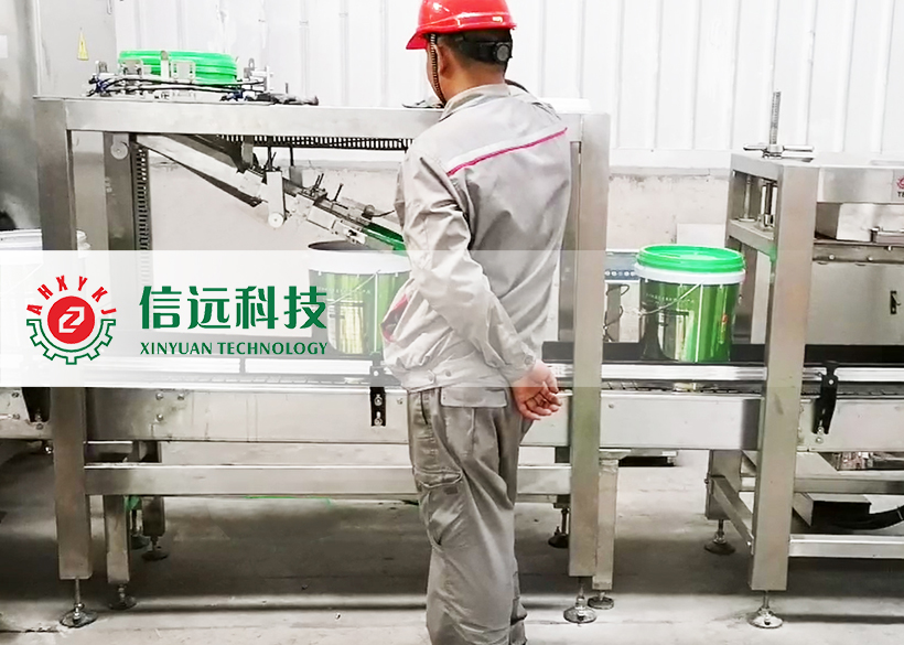 ■上蓋和旋蓋/壓蓋工段:配有全自動上蓋機,實現(xiàn)有序精準掛蓋上蓋。小口桶采用全自動抓旋式旋蓋機,可以根據(jù)桶蓋大小進行尺寸調(diào)節(jié)和擰蓋力度,兼容多種螺紋瓶蓋;廣口桶采用全自動滾壓式壓蓋機,根據(jù)不同尺寸的桶蓋,在主軸上調(diào)整對應(yīng)尺寸的螺母位置,即可正常封蓋,適用于各種國際通用的標準桶封蓋。旋蓋/壓蓋機構(gòu)運行穩(wěn)定,可以保證封蓋質(zhì)量和精密度。