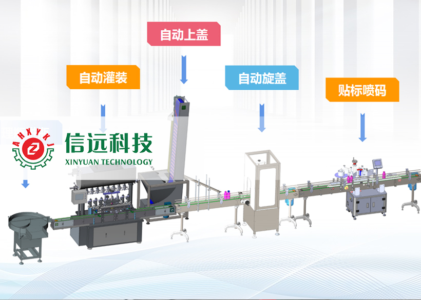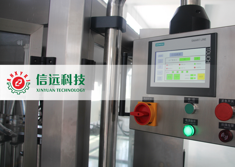 信遠(yuǎn)科技瓶裝液體全自動灌裝機(jī)組,由理瓶機(jī)、灌裝機(jī)、上蓋/旋蓋機(jī)和貼標(biāo)噴碼機(jī)組成。可以灌裝單瓶容量在50-1000ml范圍之間的液體物料,生產(chǎn)企業(yè)可以根據(jù)自己的需要,選擇不同型號的灌裝機(jī)和配套輔機(jī)。這套機(jī)組設(shè)備采用不銹鋼材質(zhì)設(shè)計(jì)制造,適用于食品、化工、醫(yī)藥等行業(yè)不帶氣體的流體、半流體物料的計(jì)量灌裝,具有自動完成理瓶、進(jìn)瓶、定位、灌裝、出瓶、上蓋、旋蓋、鋁箔封口、貼標(biāo)、噴碼等一系列功能。