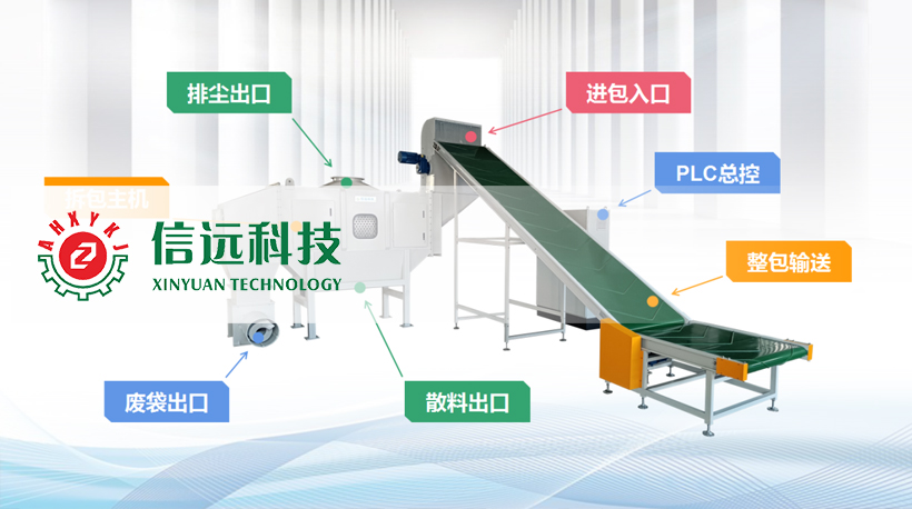 信遠(yuǎn)科技新一代全自動破包機,由運送、破包、過濾、排塵、廢袋輸出等裝置組成。該機采用自動切包和滾筒篩分的方式,對25-50kg重量的袋裝粉料或顆粒料在密閉狀態(tài)下進行拆包、篩分和卸料。適用于不同材質(zhì)和型號的編織袋、PP/PE袋、牛皮紙袋等袋裝物料的拆包卸料工作。