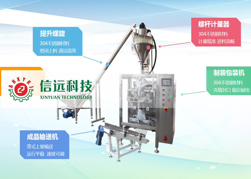 信遠(yuǎn)科技粉劑全自動(dòng)立式制袋包裝機(jī)組,是由密閉螺旋提升機(jī)、螺旋計(jì)量機(jī)、立式制袋包裝機(jī)和成品輸送機(jī)組成,可以包裝單袋克重在30-5000g范圍之間的粉狀物料,生產(chǎn)企業(yè)可以根據(jù)自己的需求選擇不同的包裝機(jī)型號。這套機(jī)組設(shè)備適合粉料和較大粉塵的超細(xì)粉狀物料的定量包裝,具有自動(dòng)完成送料、計(jì)量、制袋、充填、封口、切包、打印、計(jì)數(shù)、輸送等一系列功能,是食品、化工、醫(yī)藥等行業(yè)提高包裝生產(chǎn)效率,打造無塵環(huán)保車間,提升包裝檔次的必選設(shè)備。