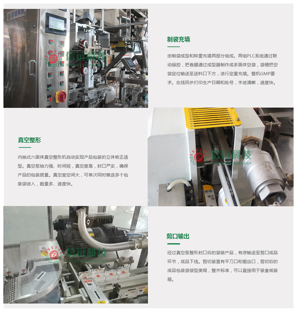 全自動(dòng)六面體真空整形包裝機(jī)組可以實(shí)現(xiàn)全自動(dòng)上料、制袋、稱重、充填、整形、抽真空、封口、剪袋口、成品輸送于一體。通過內(nèi)抽真空的方式,將散放物料包裝成為單袋克重在100-1000g范圍之間的具有高附加值的六面體定重成型小包裝。六面體真空整形包裝機(jī)組廣泛應(yīng)用于大米、雜糧等顆粒產(chǎn)品以及咖啡、酵母等粉料產(chǎn)品的真空包裝,袋型美觀,包裝速度快,運(yùn)行穩(wěn)定,密封效果好,保鮮保質(zhì)時(shí)間長。適合批量生產(chǎn),便于裝盒、裝箱或直接零售。