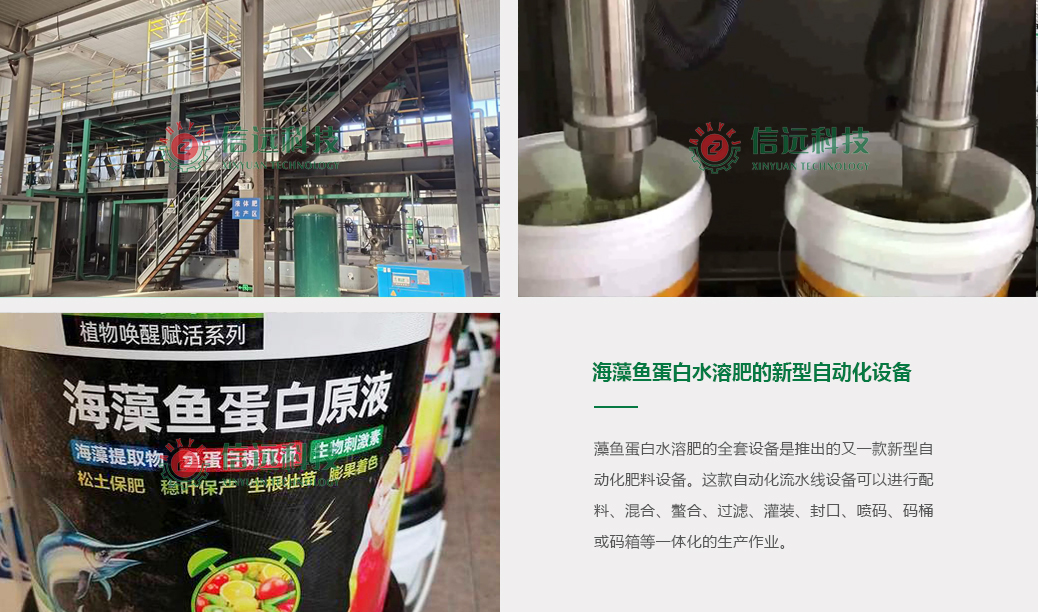 近年來,安徽信遠(yuǎn)包裝科技有限公司研發(fā)推出的水溶肥類生產(chǎn)設(shè)備比較多,其中用于生產(chǎn)海藻魚蛋白水溶肥的全套設(shè)備,是繼大量元素水溶肥設(shè)備、中量元素水溶肥設(shè)備、微量元素水溶肥設(shè)備、含腐植酸水溶肥設(shè)備、含氨基酸水溶肥設(shè)備、含黃腐酸鉀水溶肥設(shè)備等之后,推出的又一款新型自動化肥料設(shè)備。這款自動化流水線設(shè)備可以進(jìn)行配料、混合、螯合、過濾、灌裝、封口、噴碼、碼桶或碼箱等一體化的生產(chǎn)作業(yè)。