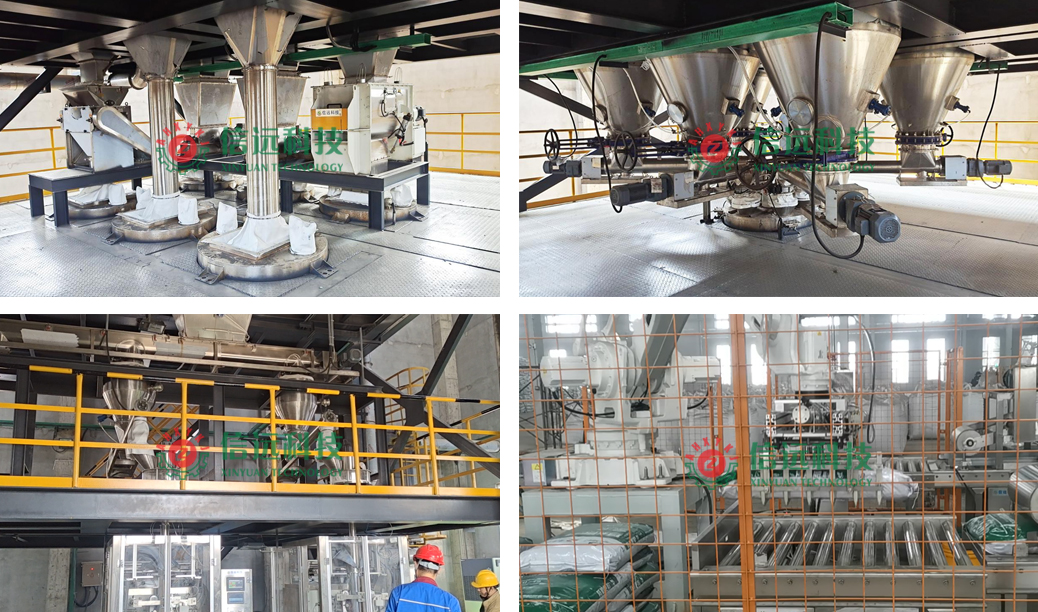 該套自動化藥肥生產(chǎn)線為塔式立體結(jié)構(gòu)設(shè)計,由投料系統(tǒng)、預處理系統(tǒng)、配料系統(tǒng)、混合系統(tǒng)和包裝系統(tǒng)組成。配方原料通過升降機運送到投料平臺,完成藥、肥原料的投送;結(jié)塊原料、顆粒原料經(jīng)過破碎、粉碎處理,進入配混環(huán)節(jié);包裝環(huán)節(jié)設(shè)備配置有全自動重袋上袋包裝機和全自動小袋制袋包裝機,可以生產(chǎn)不同克重規(guī)格的袋裝粉劑藥肥產(chǎn)品。