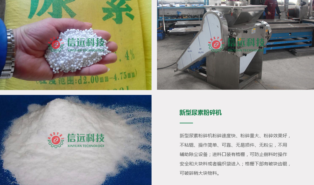 安徽信遠(yuǎn)包裝科技有限公司技術(shù)團(tuán)隊(duì)研發(fā)設(shè)計(jì)的新型尿素粉碎機(jī),已經(jīng)供應(yīng)投入市場。該設(shè)備主要用于顆粒尿素粉碎,也可以用于其它單一化肥原料的粉碎。廣泛用于復(fù)合肥廠高氮肥粉碎、水溶肥粉碎等。該尿素粉碎機(jī)運(yùn)用兩個(gè)高速相向運(yùn)轉(zhuǎn)的輥筒對顆粒原料進(jìn)行研磨擠壓,間隙大小決定其物料的粉碎程度,粉碎細(xì)度由雙輥間距控制,間距越小細(xì)度越細(xì),產(chǎn)量也會相對降低,加料越均勻粉碎效果越好,產(chǎn)量相對提高。