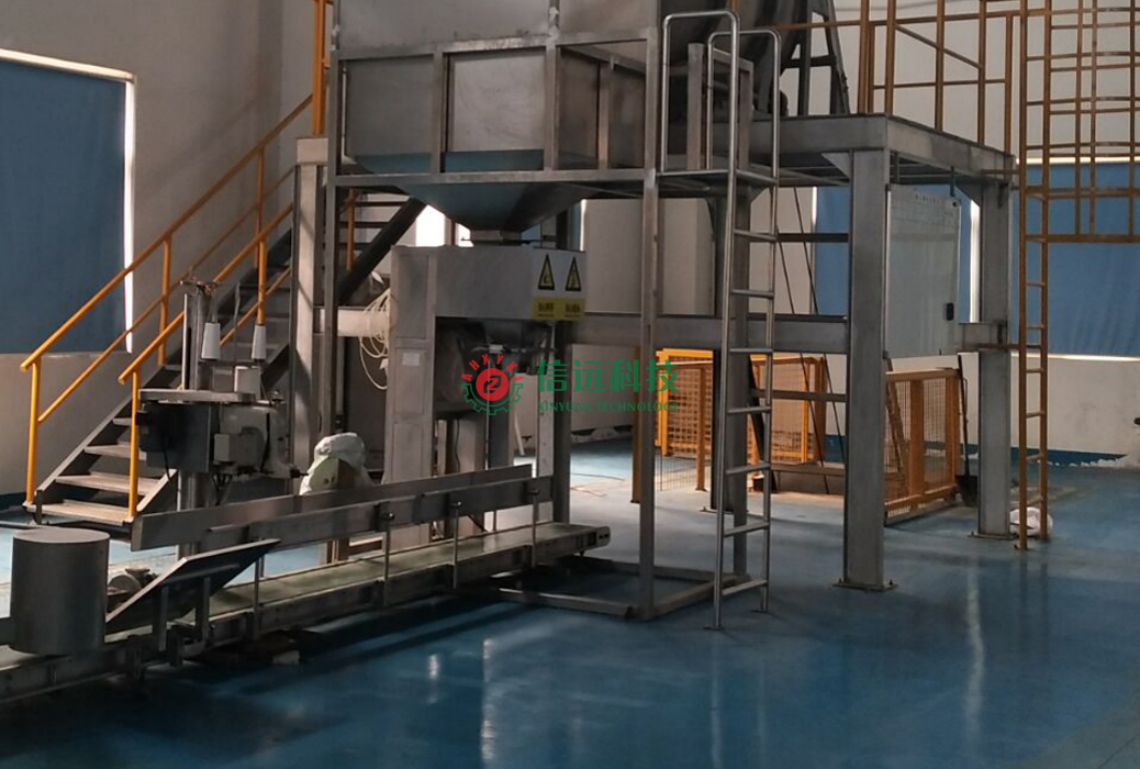 信遠(yuǎn)科技的這款顆粒料無(wú)斗包裝秤的工作原理是:由人工先套上包裝袋,然后自動(dòng)夾袋,系統(tǒng)檢測(cè)包裝袋到位后,無(wú)斗秤進(jìn)行稱重去皮工序;喂料機(jī)根據(jù)控制儀表設(shè)定的程序進(jìn)行快速加料,當(dāng)落入包裝袋中的物料達(dá)到預(yù)定的慢速計(jì)量重量時(shí),無(wú)斗稱開(kāi)始慢速精確加料;稱重后,如果偏差太大,可報(bào)警通知人工處理或自動(dòng)慢速補(bǔ)重,直至達(dá)到穩(wěn)定的預(yù)定重量,完成加料工序;當(dāng)包裝秤判斷正常加料完成后,系統(tǒng)發(fā)出松袋信號(hào),包裝袋下落,打印機(jī)打印標(biāo)簽,產(chǎn)品進(jìn)入封袋、包裝工序;不斷往復(fù),實(shí)現(xiàn)自動(dòng)化包裝的定值包裝。然后通過(guò)輸送機(jī)推送到縫包機(jī)前,完成包裝成品。