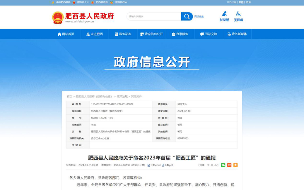 近日,肥西縣人民政府發(fā)布《關(guān)于命名2023年首屆“肥西工匠”的通報(bào)》。安徽信遠(yuǎn)包裝科技有限公司項(xiàng)目中心總監(jiān)、電氣工程部總監(jiān)王聲根同志被命名為首屆“肥西工匠”稱號(hào)。