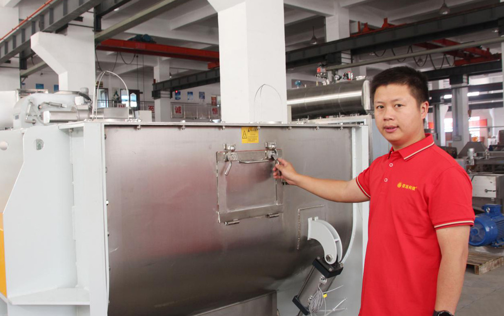先介紹第一款混合機——螺帶混合機。該機為臥式U型筒體結(jié)構(gòu)設(shè)計,攪拌器主軸上,盤繞兩組方向相反的內(nèi)、外雙層螺帶。當攪拌器工作時,內(nèi)螺旋帶動靠近軸心處物料做軸心旋轉(zhuǎn),軸向由內(nèi)至兩側(cè)推動,外螺旋帶動靠近筒壁物料做軸心旋轉(zhuǎn),軸向由兩側(cè)至內(nèi)推動,形成物料在筒體內(nèi)循環(huán)摻混,短時間內(nèi)完成物料的快速翻動混合。隨著螺旋的推動,物料可以干凈的從筒體中心底部出料口快速卸料。