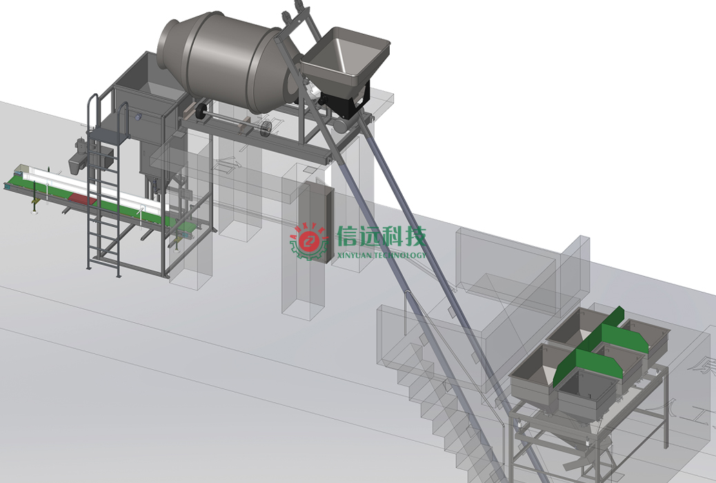 信遠科技研發(fā)制造的小型摻混肥設(shè)備,由主體設(shè)備和輔助設(shè)備兩大部分配置組成,主體設(shè)備包括:自動配料單元、自動攪拌混合單元、自動包裝單元,自動控制系統(tǒng);輔助設(shè)備包括:投料平臺、爬斗輸送機、皮帶輸送機、縫包機、氣泵、支架平臺等。該小型摻混肥設(shè)備由人工進行投料配料,爬斗提升機把配合好的物料輸送至混合機,混合均勻后進入定量包裝和封口輸送環(huán)節(jié),完成包裝成品。