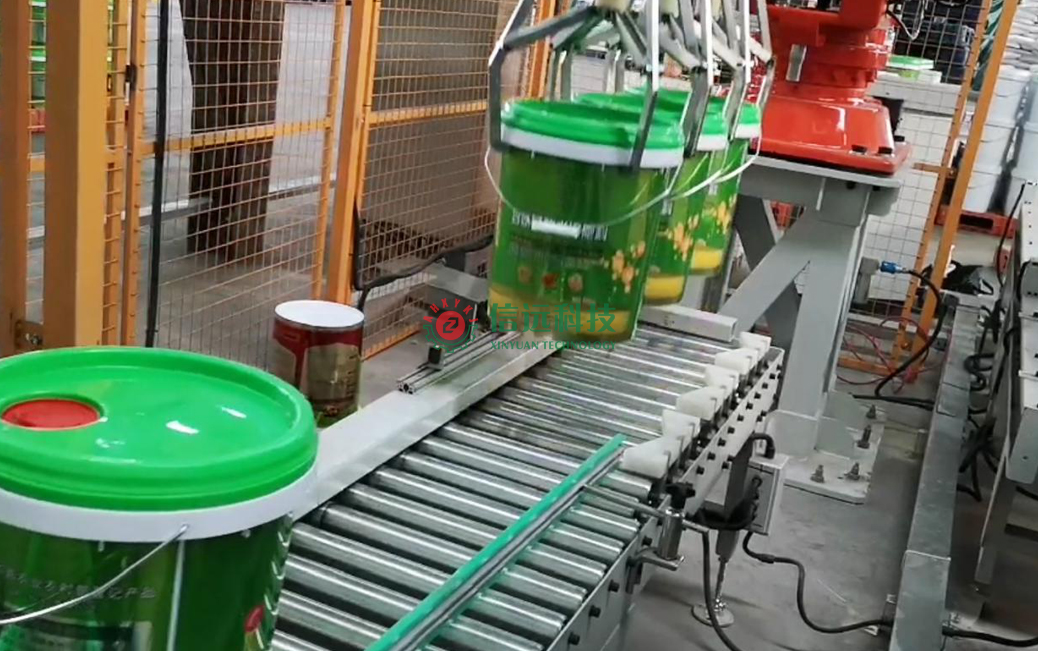 機(jī)械臂式碼垛機(jī)器人,在面對(duì)不同的桶型產(chǎn)品時(shí),可以通過(guò)更換不同類型的頭部夾具來(lái)實(shí)現(xiàn)對(duì)不同桶型產(chǎn)品的抓取、搬運(yùn)和碼垛。比如,圓桶裝的包裝物可以采用夾爪式工具,方桶裝的包裝物可以采用夾板式工具(夾板式同樣適用于瓶裝箱體的夾取、搬運(yùn)和碼垛)。對(duì)于產(chǎn)能設(shè)計(jì)比較大的桶裝水溶肥生產(chǎn)線,可以通過(guò)增加夾具工位來(lái)實(shí)現(xiàn)。該碼垛機(jī)器人可以與抓桶輸送機(jī)和托盤(pán)輸送機(jī)進(jìn)行同步連接,實(shí)現(xiàn)高效率的自動(dòng)化碼垛作業(yè)。