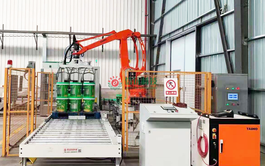 各位網(wǎng)友大家好,前面的兩期內(nèi)容我們分別講了生產(chǎn)液體水溶肥的桶裝灌裝機(jī)、瓶裝灌裝機(jī)及其關(guān)聯(lián)的配套設(shè)備,本期我們來(lái)講生產(chǎn)線的尾部終端設(shè)備——大桶碼垛機(jī)器人,該機(jī)器人采用機(jī)械臂式設(shè)計(jì),可以輕松靈活的完成對(duì)大桶型液體水溶肥產(chǎn)品的抓取、搬運(yùn)和碼垛作業(yè)。目前各大肥料工廠在產(chǎn)品碼垛方面,廣泛采用了這種全自動(dòng)化的機(jī)器人,解決了傳統(tǒng)人工碼垛工作強(qiáng)度大,工作效率慢,以及員工需要承受搬運(yùn)堆垛帶來(lái)的巨大壓力等方面的問(wèn)題。