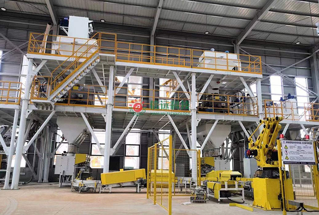 信遠(yuǎn)科技全自動(dòng)膩?zhàn)臃凵a(chǎn)線,采用高效螺帶干粉混合機(jī),該機(jī)是在多代機(jī)型的技術(shù)基礎(chǔ)上融合多種優(yōu)勢(shì)研發(fā)而制,具有自動(dòng)喂料,氣動(dòng)放料,筒壁無積塊、無死角的優(yōu)良性能。年產(chǎn)兩到三萬噸左右的小噸位膩?zhàn)臃凵a(chǎn)設(shè)備,一般情況下會(huì)用到4-6個(gè)原料罐,合理滿足各種配料的供給需求。計(jì)量系統(tǒng)在計(jì)量螺旋的配合下,把料倉中的原料導(dǎo)入計(jì)量倉,通過傳感器的數(shù)據(jù)反饋,實(shí)現(xiàn)計(jì)量包裝。輸送線配備整形、清灰、噴碼多道工序,保證每一袋產(chǎn)品外觀干凈整潔、形狀整齊化一,然后碼垛、纏繞覆膜。大大提高出廠產(chǎn)品的外觀檔次,實(shí)實(shí)在在的增加了產(chǎn)品的市場(chǎng)競爭力。