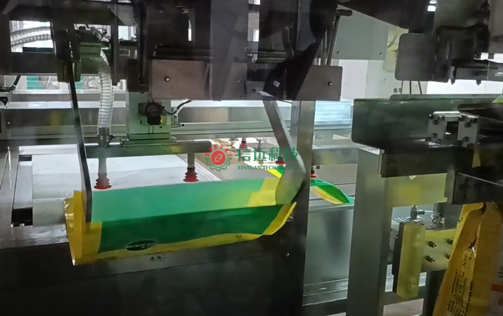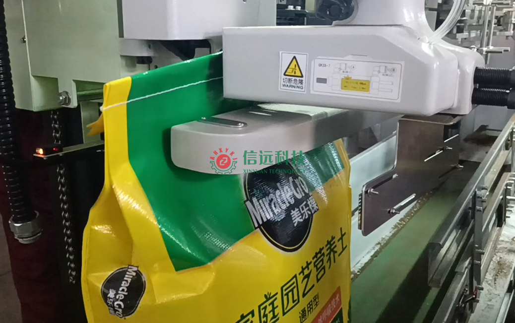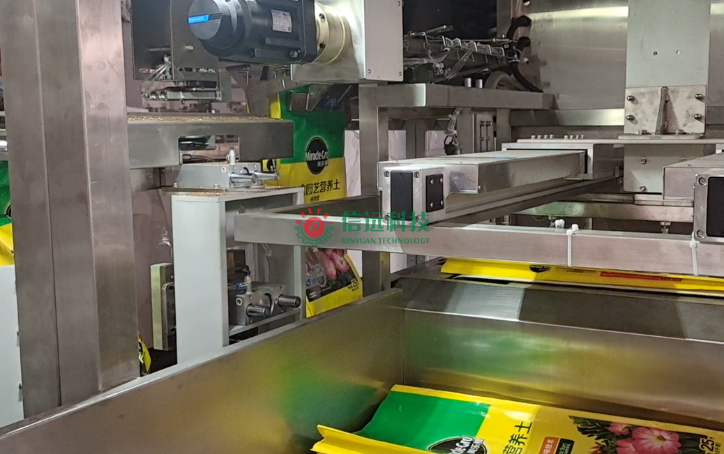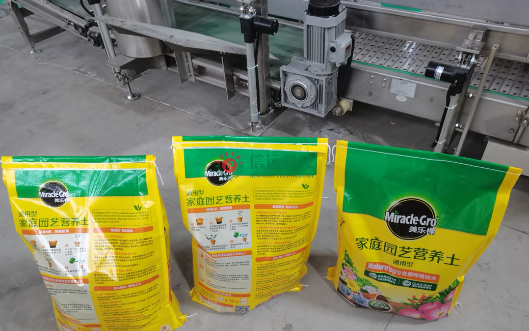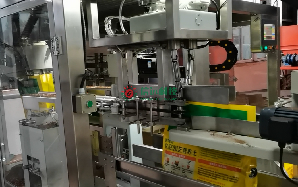 安徽信遠(yuǎn)包裝科技有限公司作為國內(nèi)知名的農(nóng)資農(nóng)化設(shè)備專業(yè)制造商,按約為該品牌營養(yǎng)土生產(chǎn)商提供了成套的自動化包裝機(jī)設(shè)備,該設(shè)備是一套給袋式重袋包裝系統(tǒng)。生產(chǎn)流程是配方原料通過計量料倉喂料至重袋包裝機(jī),在前端上袋機(jī)的配合下,自動完成取袋、上袋、套袋、夾袋、計量、充填、抱袋、振實(shí)等作業(yè);包裝機(jī)后端與縫包機(jī)相聯(lián),在導(dǎo)袋機(jī)構(gòu)和皮帶輸送機(jī)的配合下,自動完成移栽、導(dǎo)袋、折邊、縫合、剪線等工序,完成成品輸出。