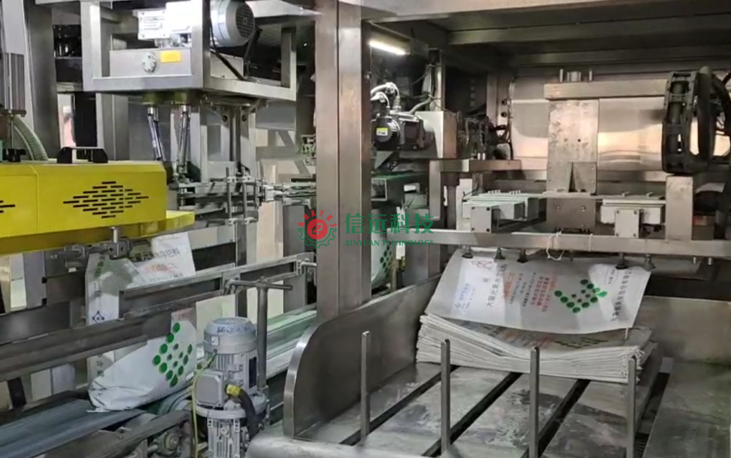 安徽信遠(yuǎn)包裝科技有限公司設(shè)計(jì)制造的水溶肥全自動(dòng)包裝碼垛生產(chǎn)線設(shè)備,是一套固體粉劑重袋包裝碼垛系統(tǒng),由上袋機(jī)、包裝機(jī)、縫包機(jī)、噴碼機(jī)、輸送理包系統(tǒng)、碼垛機(jī)器人和托盤庫(kù)等裝置組成,可以自動(dòng)完成取袋、上袋、開袋、套袋、夾袋和計(jì)量充填,袋內(nèi)重量達(dá)到設(shè)定值時(shí),自動(dòng)停止充填并松袋落袋,抱袋裝置自動(dòng)移栽至縫包機(jī)前,完成包裝袋封口。成品袋在輸送過程中,自動(dòng)完成倒包、振實(shí)、壓平等理包整形后(托盤庫(kù)自動(dòng)同步供盤),機(jī)器人進(jìn)行抓包碼垛,叉車搬運(yùn)入庫(kù)。