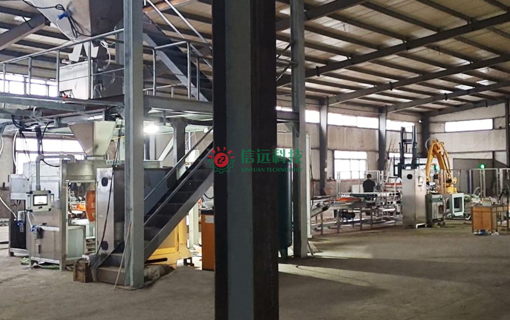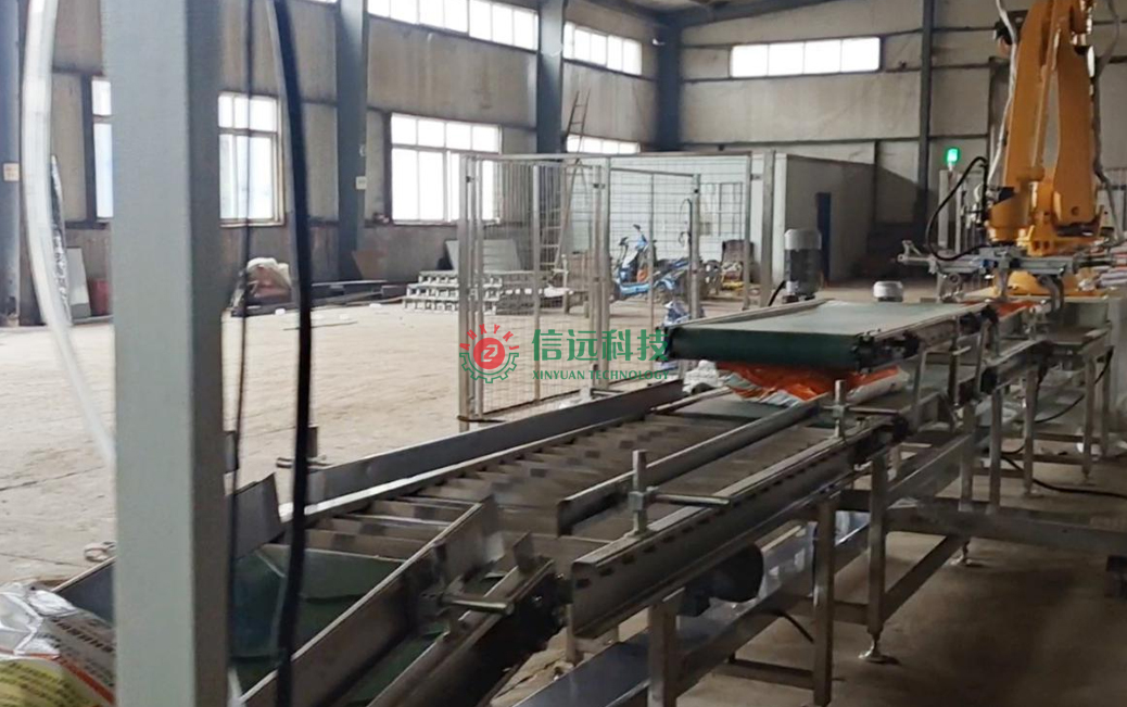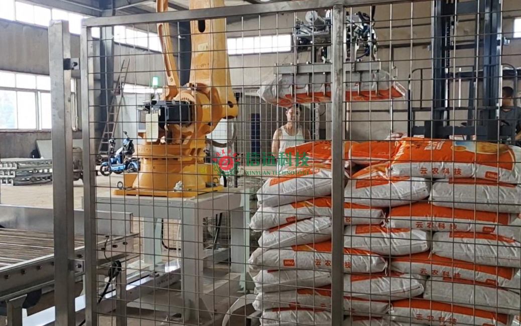 安徽信遠包裝科技有限公司設計制造的摻混肥全自動包裝碼垛生產(chǎn)線設備,是一套重袋包裝碼垛系統(tǒng),由上袋機、包裝機、縫包機、噴碼機、輸送理包系統(tǒng)和碼垛機器人等裝置組成,可以自動完成取袋、上袋、開袋、套袋、夾袋和計量充填,袋內(nèi)重量達到設定值時,自動停止充填并松袋落袋,抱袋裝置自動移栽至縫包機前,完成包裝袋封口。成品袋在輸送過程中,自動完成倒包、振實、壓平等理包整形后,機器人進行抓包碼垛,叉車搬運入庫。